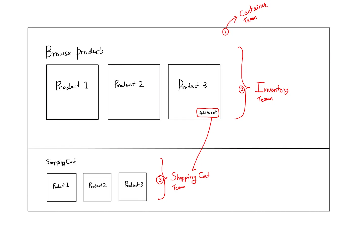 If you break it down, there are 2 teams involved in it, Inventory, and Cart teams respectively. Now the problem is, how does the page render the products section which is built by the Inventory team, and the shopping cart section which is built by the Cart team on the page? They are completely different applications serving on different hosts.